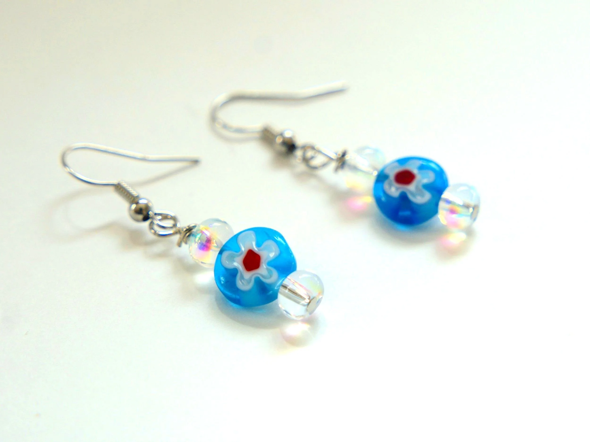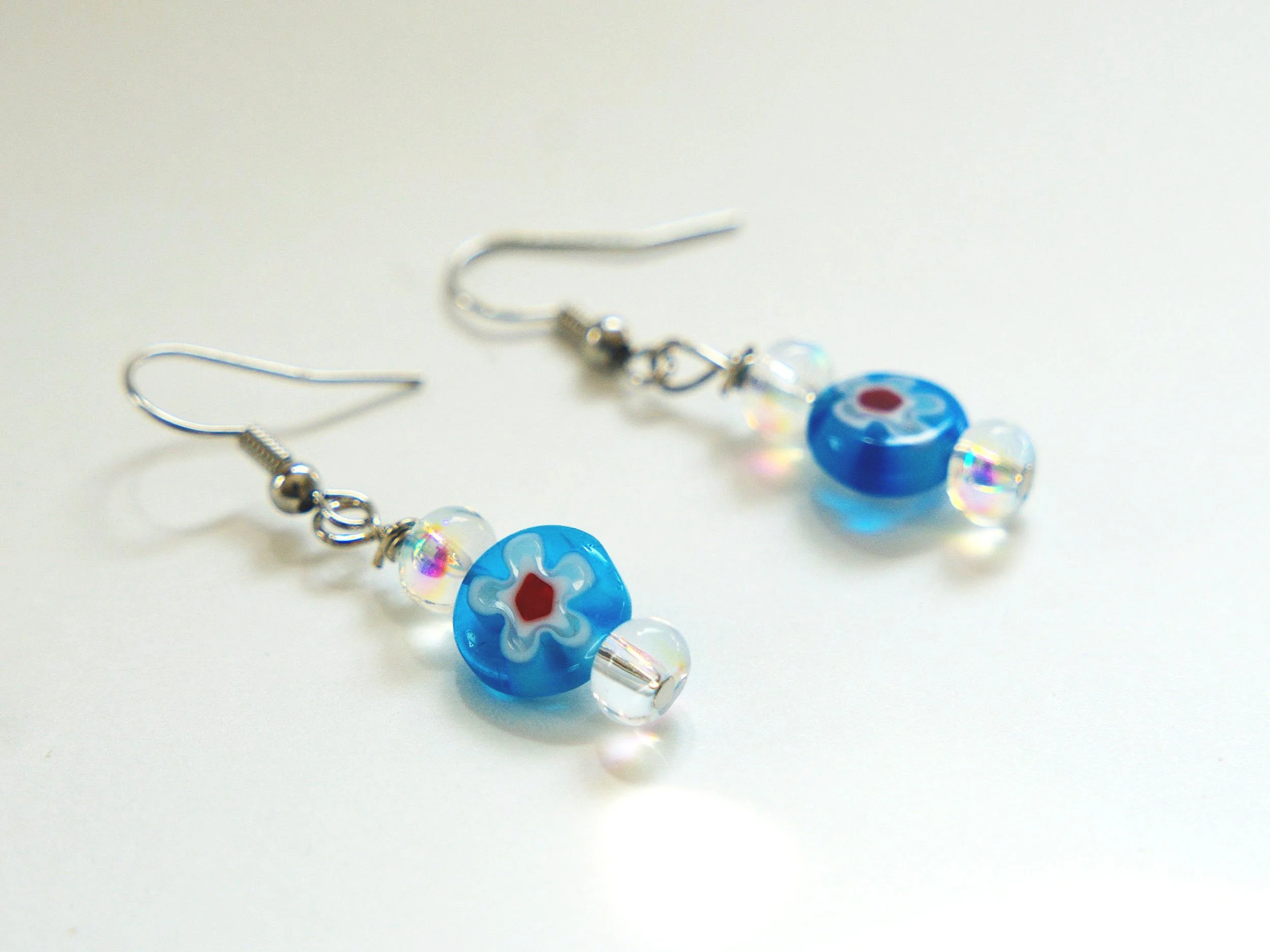 DESCRIPTIONBeautiful handmade wire wrapped baby blue millefiori glass bead earrings! Silver tone fish hook ear wires with clear iridescent accent beads ! Very beautiful earrings that catch the light, and will look amazing with anything you wear! God bless you!