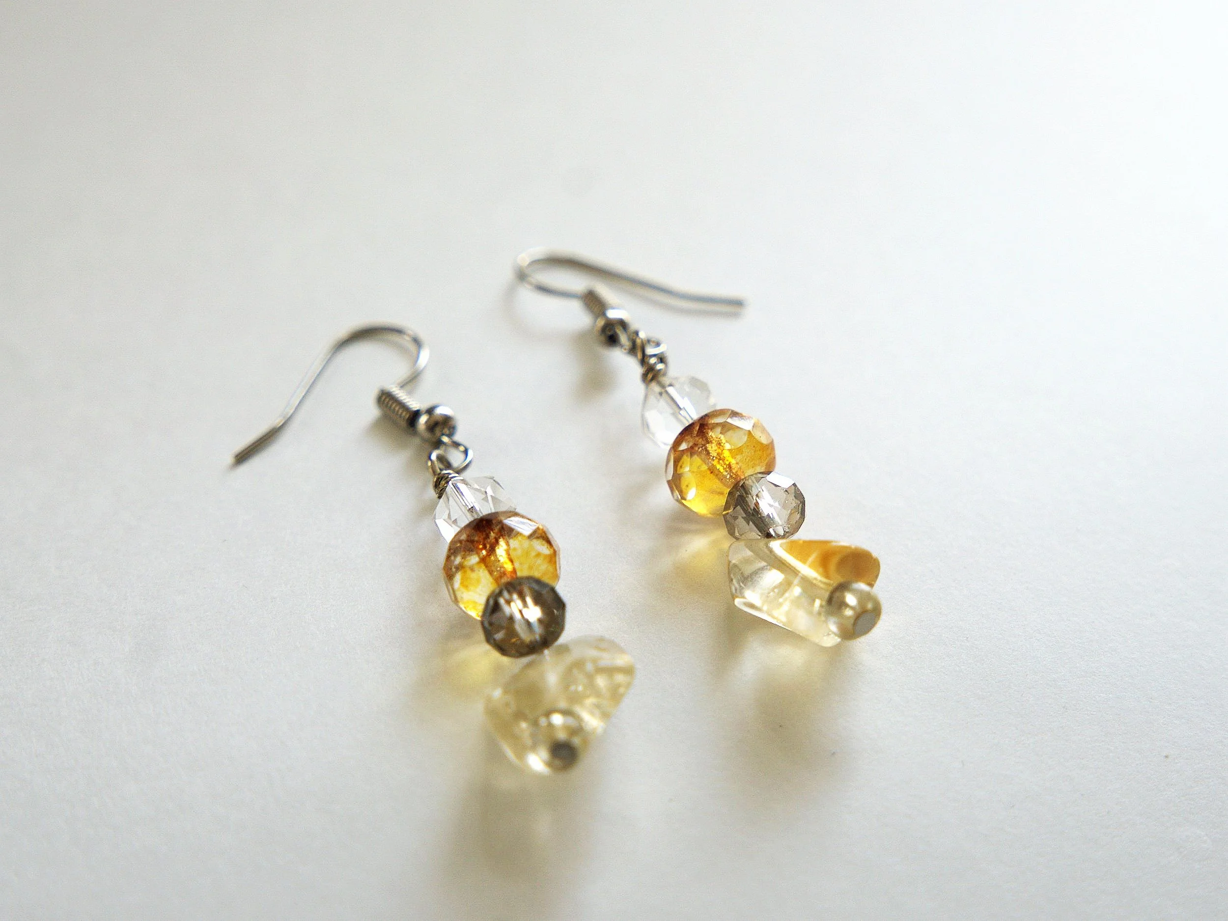 DESCRIPTIONBeautiful handmade silver tone wire wrapped Golden Citrine Crystal Earrings ! Silver tone fish hook ear wires with Genuine Golden Citrine at the end of the earring! Clear iridescent crystals, amber colored glass beads, with a silver faceted crystal! Very beautiful earrings that catch the light, and will look amazing with anything you wear! God bless you!