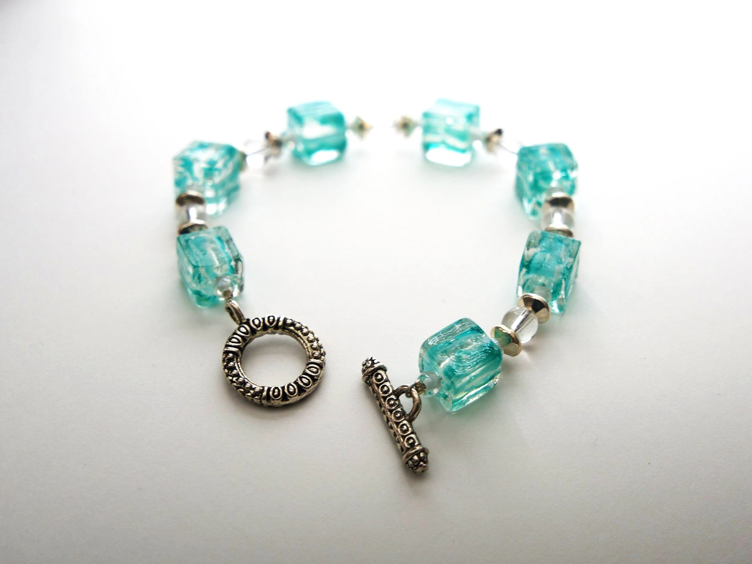 Aqua Blue Crackle Purple Glass Bead Bracelet