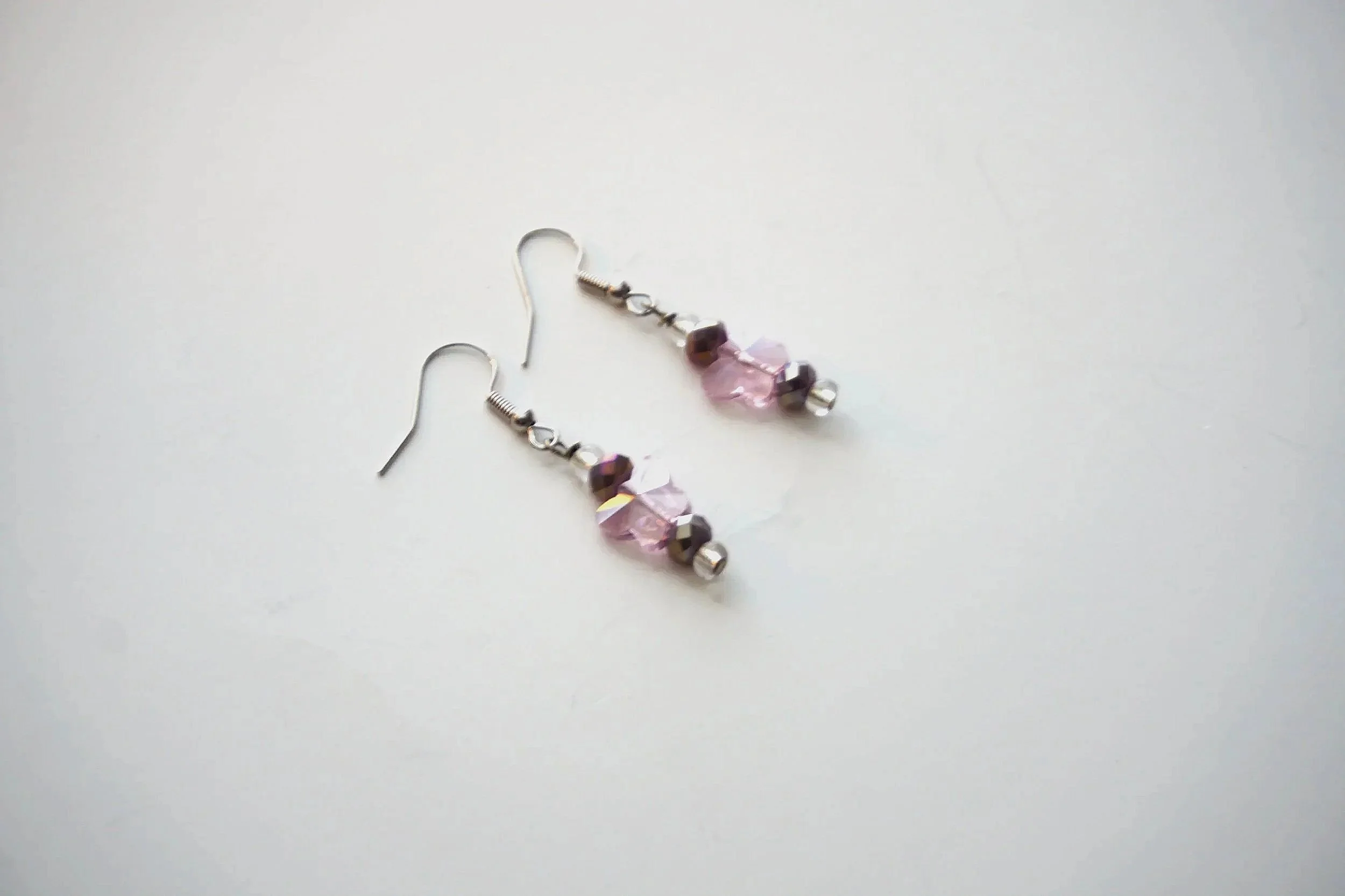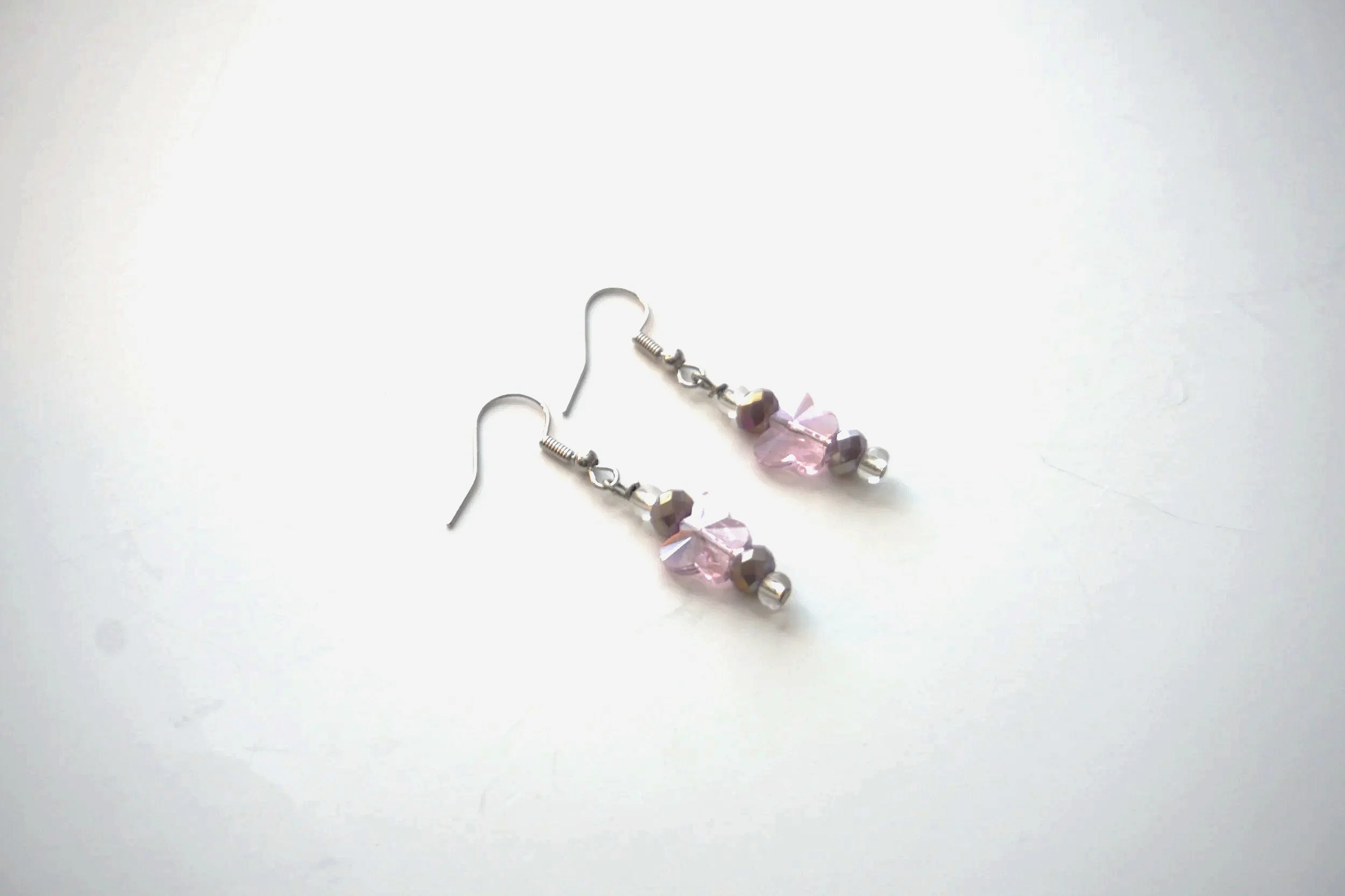 DESCRIPTIONBeautiful handmade wire wrapped antique silver butterfly earrings! Silver tone fish hook ear wires with purple glass bead on top, and faceted pink crystal bead below the butterfly! Very beautiful earrings that catch the light, and will look amazing with anything you wear! God bless you!