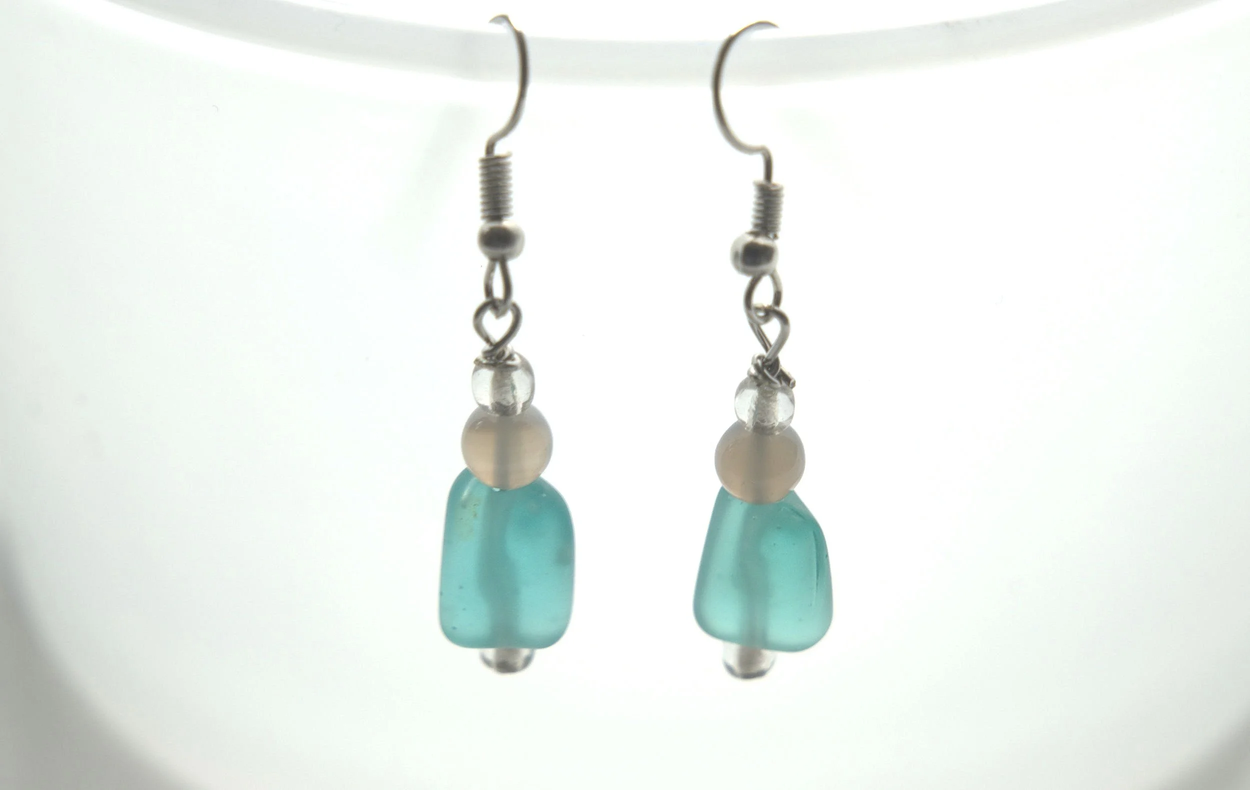 Rectangular Aqua Sea Glass - Grey Agate Earrings