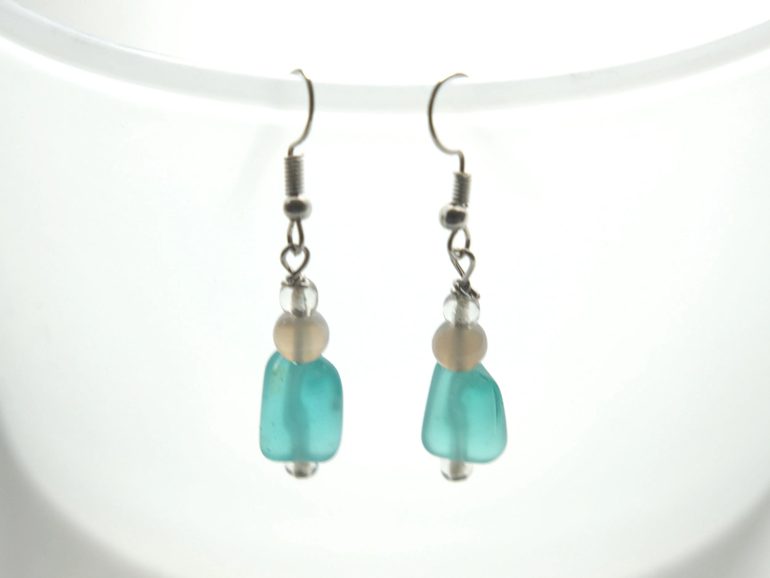 Beautiful handmade wire wrapped Rectangular Aqua Sea Glass - Grey Agate Earrings! Silver tone fish hook ear wires with genuine dyed agate! Very beautiful earrings that catch the light, and will look amazing with anything you wear! God bless you!