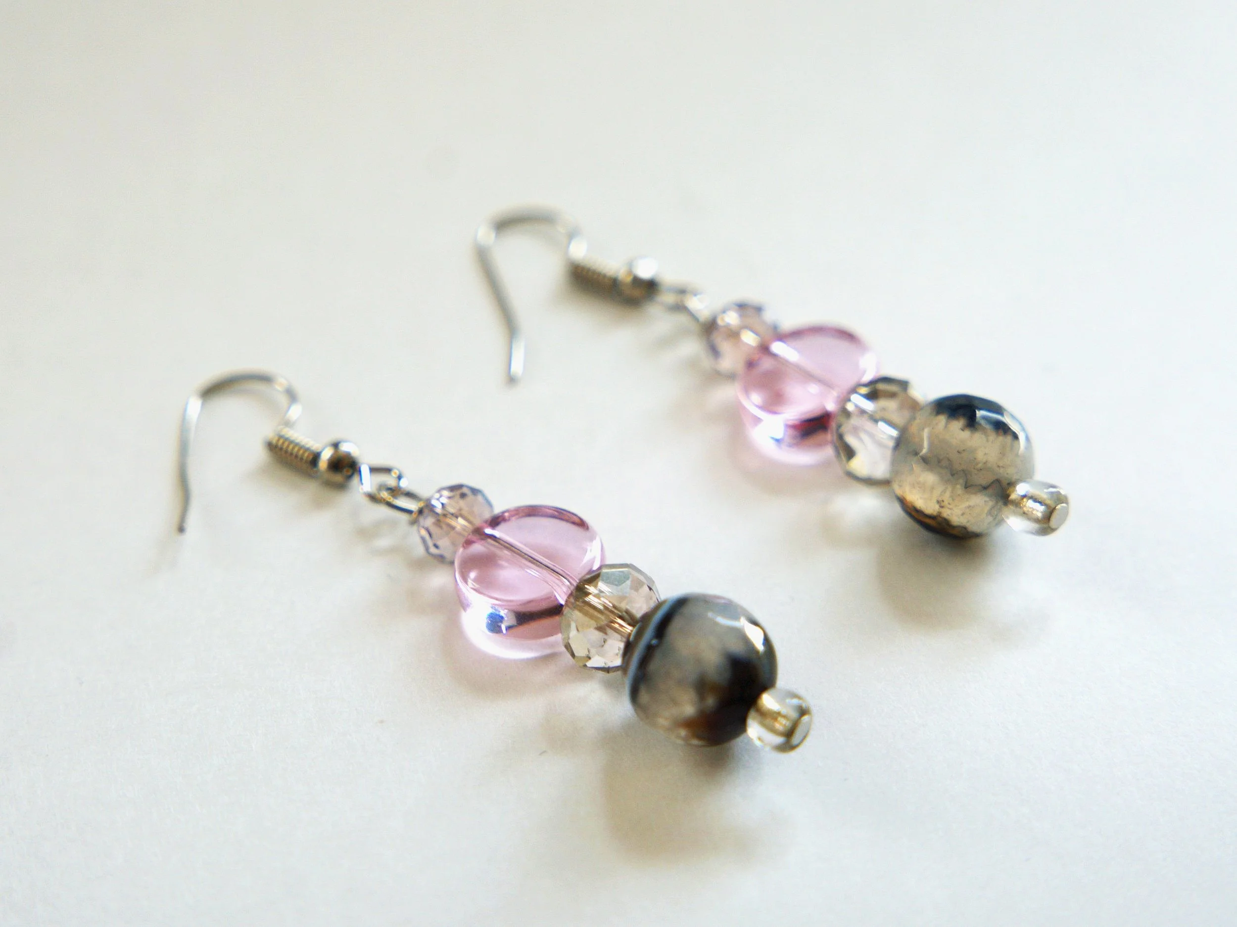 Pink Glass - Black Grey Agate Earrings