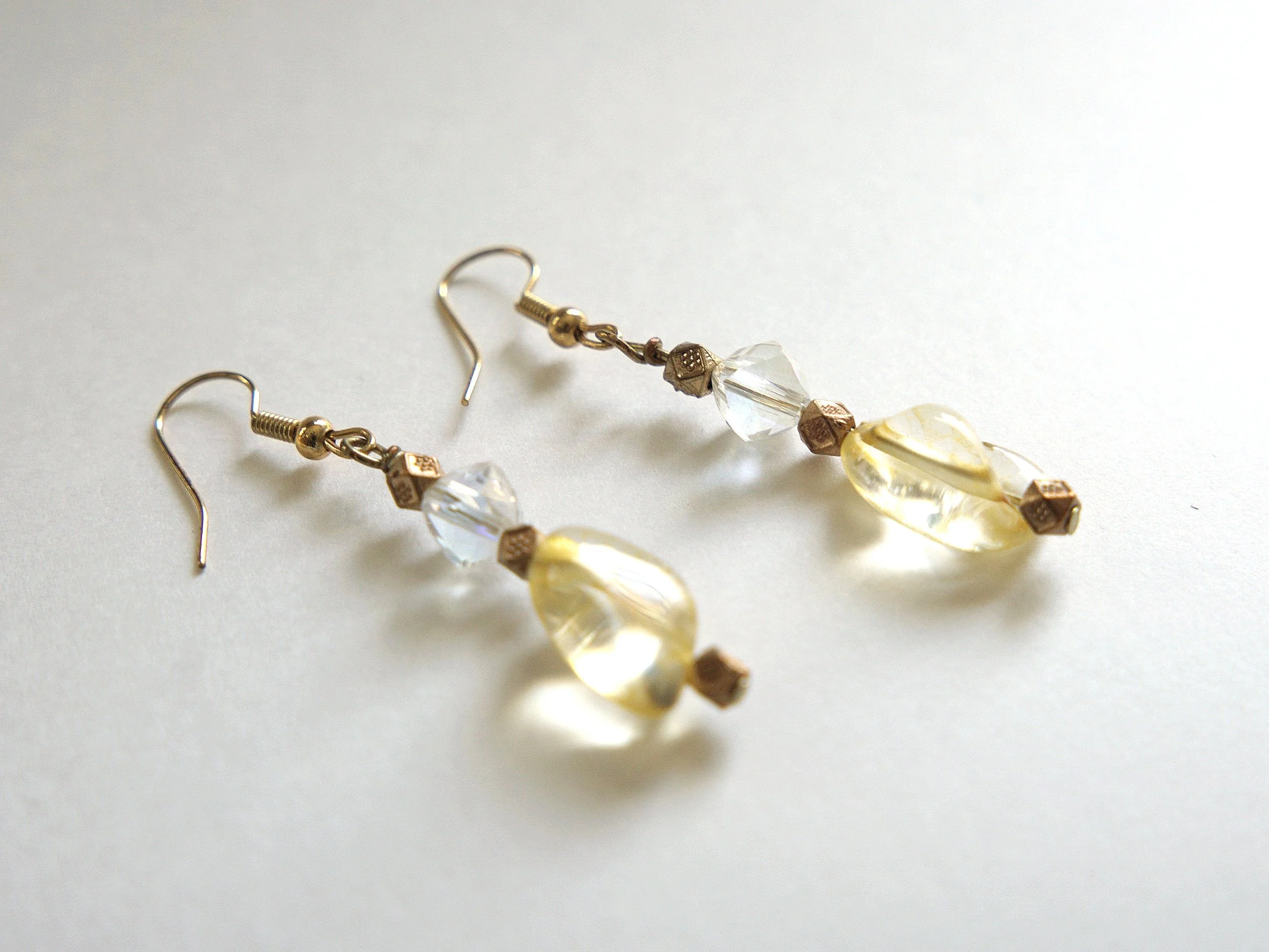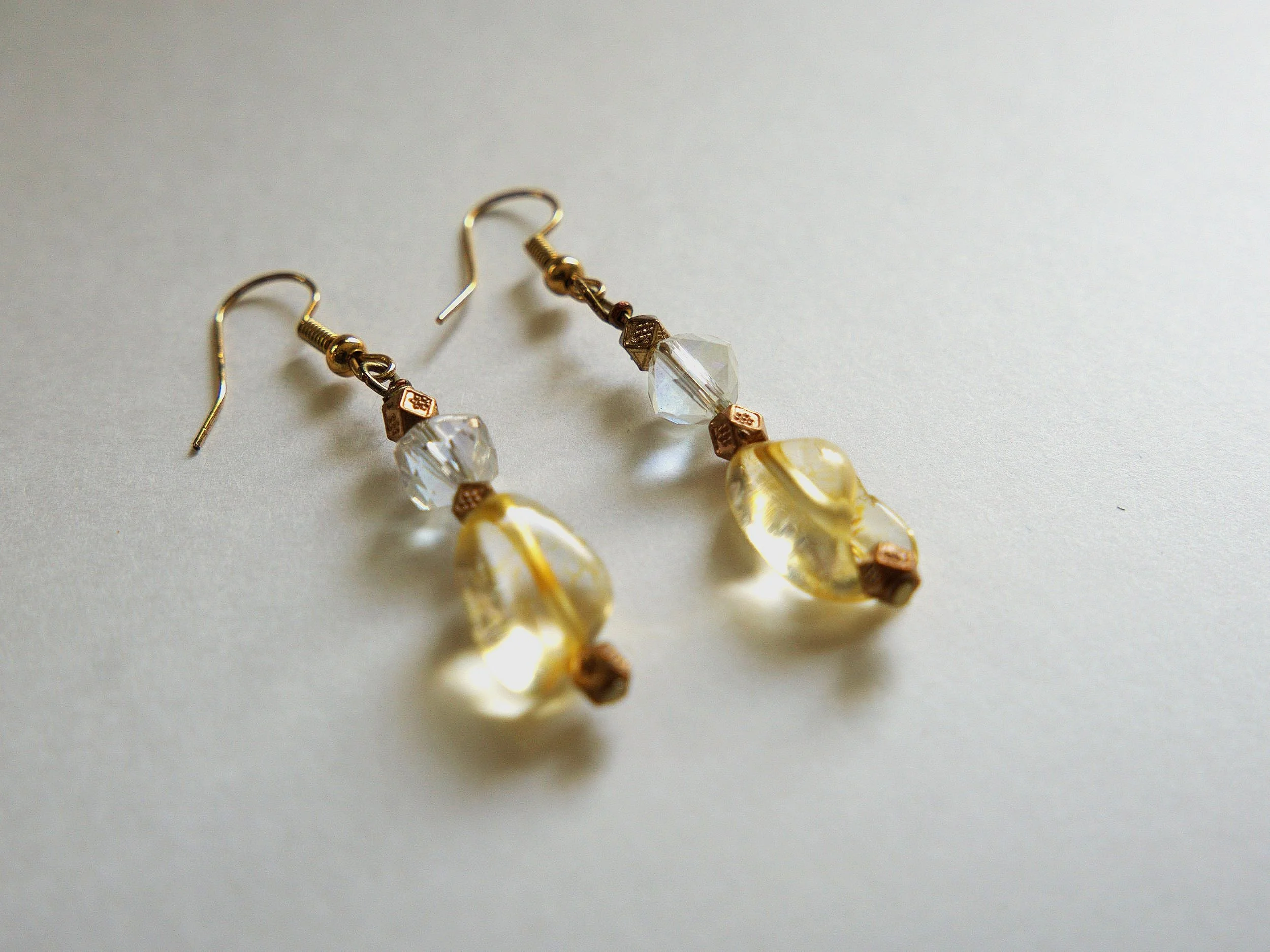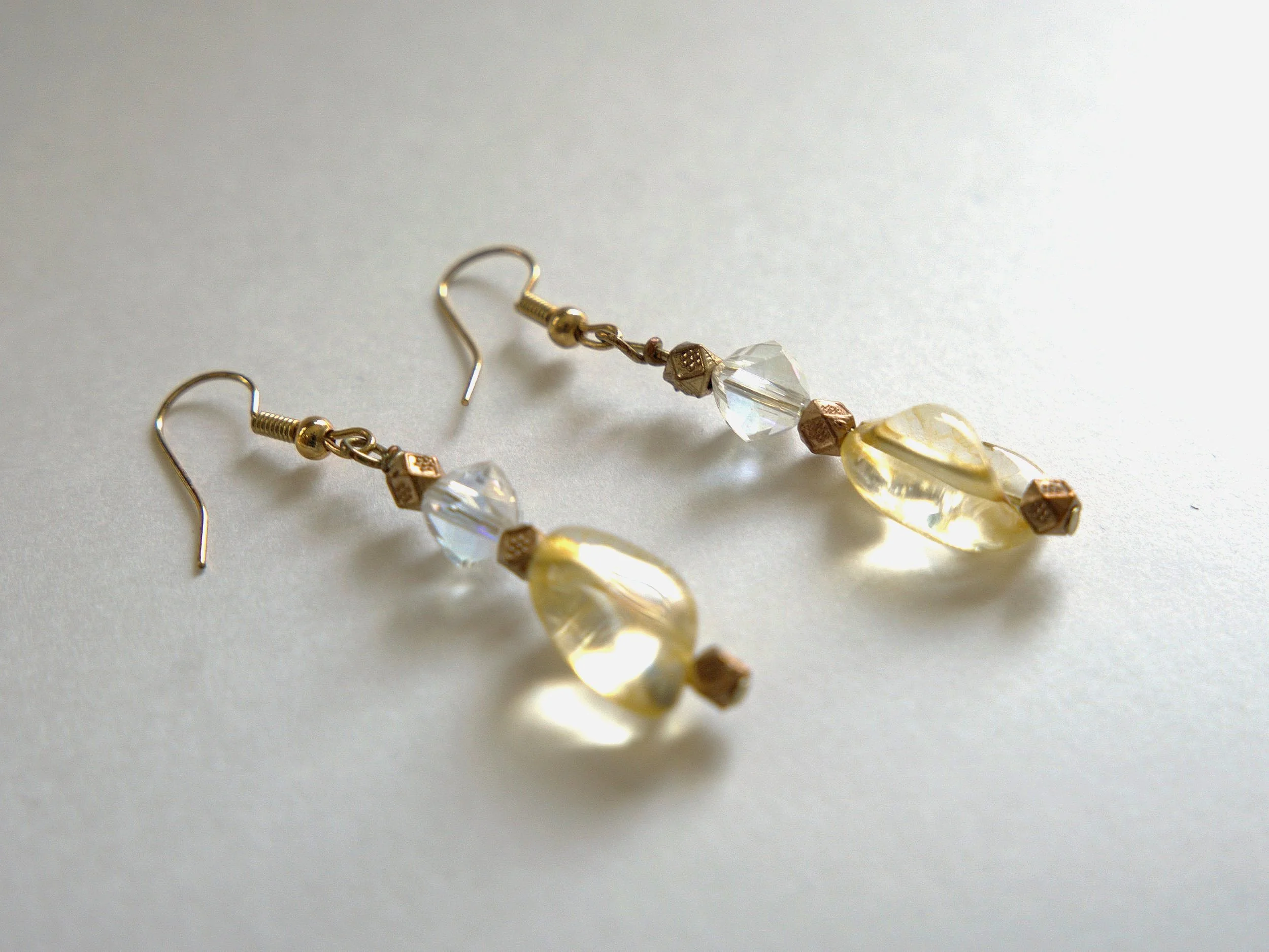 Beautiful handmade Gold tone wire wrapped Golden Citrine Crystal Earrings! Gold tone fish hook ear wires with clear iridescent crystals, with genuine citrine! Very beautiful earrings that catch the light, and will look amazing with anything you wear! God bless you!