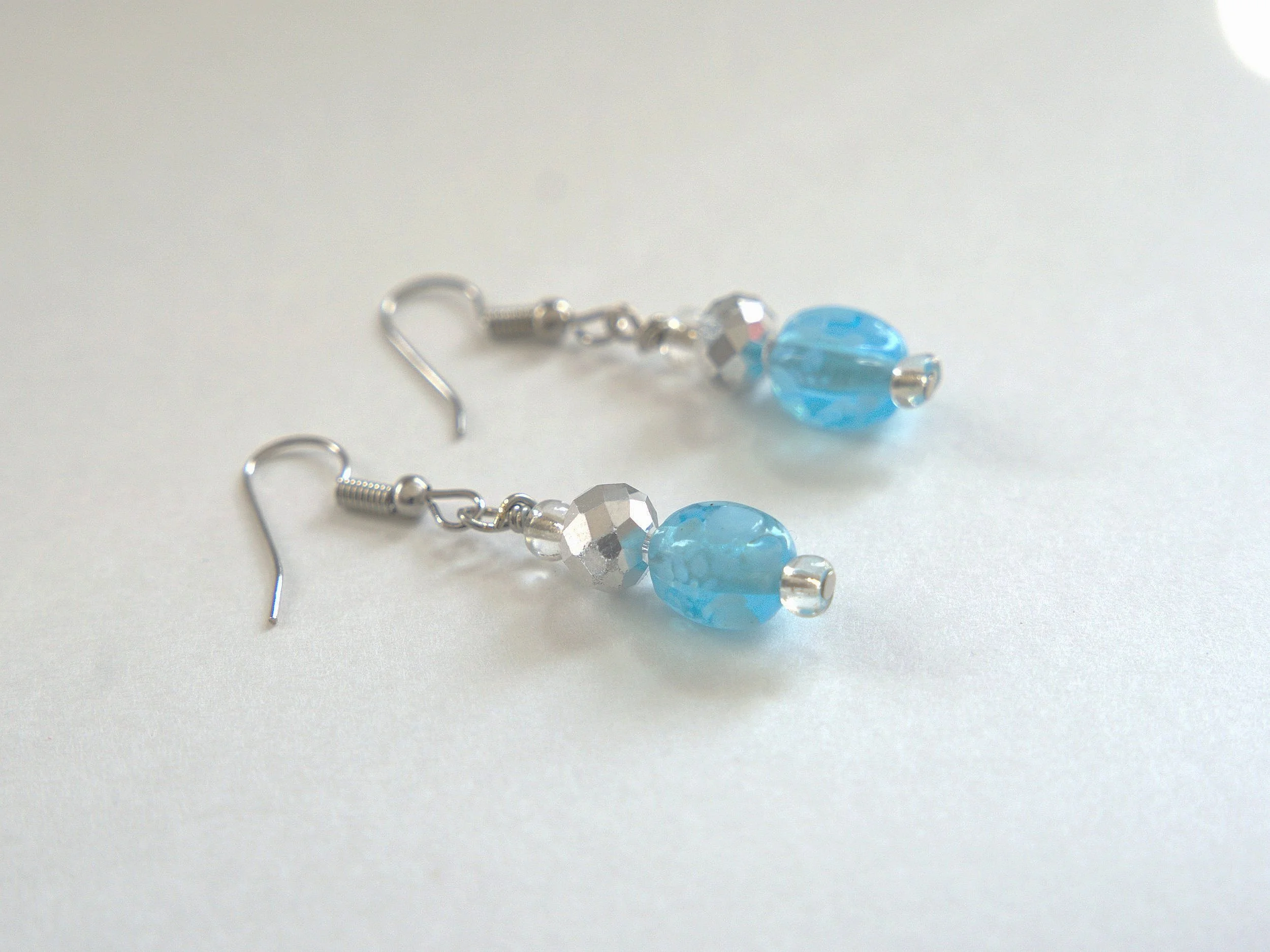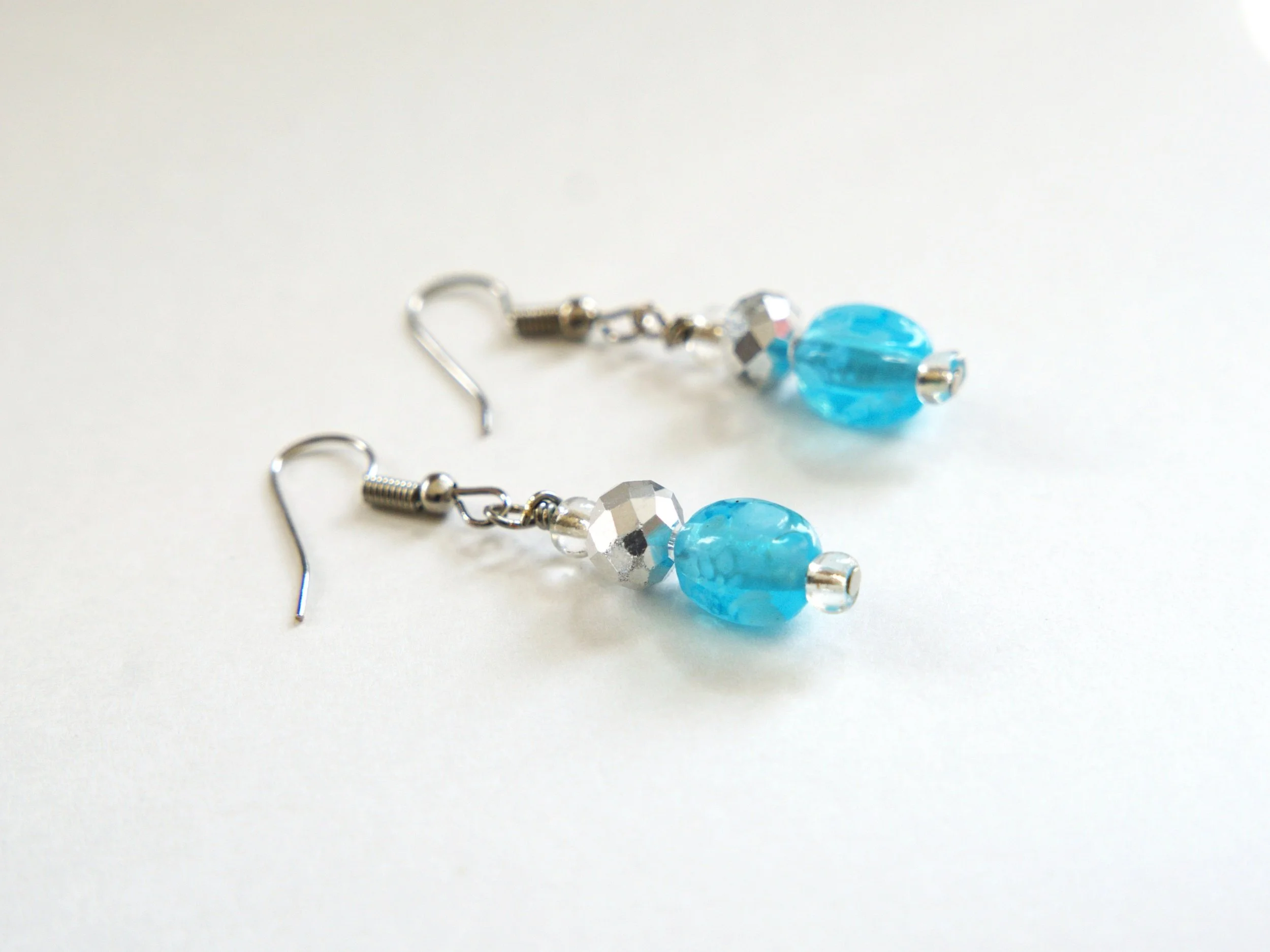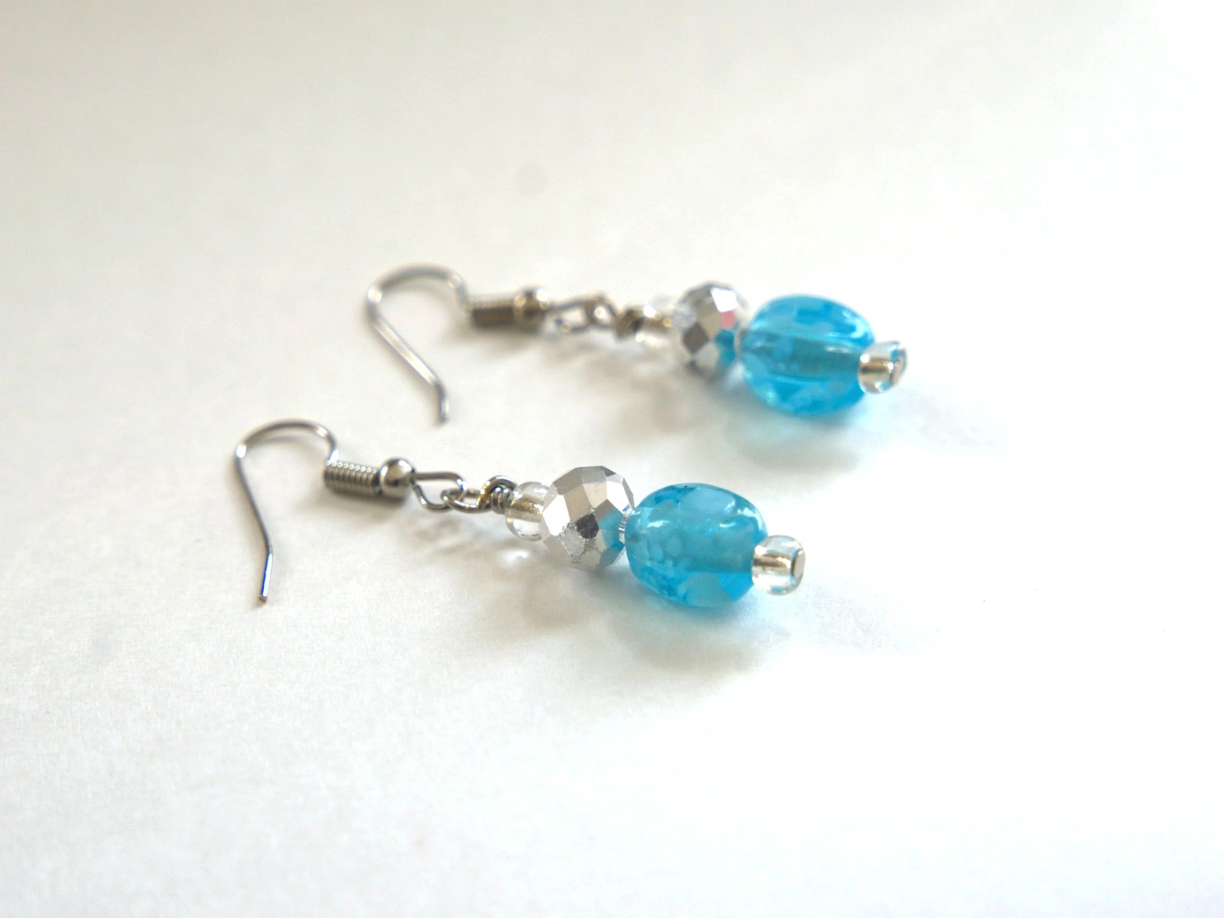 Beautiful handmade wire wrapped Blue Rain Drop Glass Bead Earrings! Silver tone fish hook ear wires with silver crystals! Very beautiful earrings that catch the light, and will look amazing with anything you wear! God bless you!